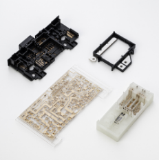 汎用プラスチックだけでなく、強度や耐熱性を持つエンプラやスーパーエンプラの射出成形においても豊富な経験と実績がございます。さらにプラスチック品にとどまらず、フィルムインサートやパワーモジュール、樹脂対樹脂のインサート成形にも対応。お客様の「ものづくり」に必要な金型のご提案やインサート品の調達まで、まるごとお任せいただけるのが当社の強みです。